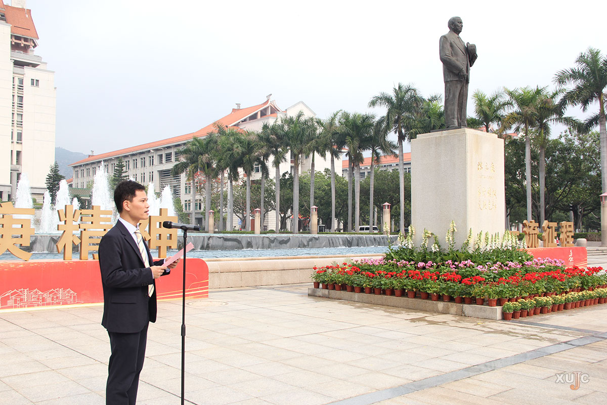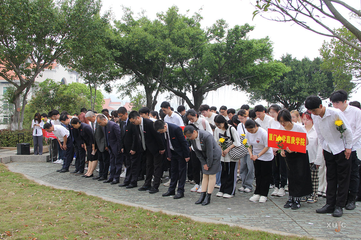 黎永强、张军奎代表厦门大学,谢火木、杨云良代表嘉庚学院,秦俭、马向华分别代表创意与创新学院、国际学院,向校主陈嘉庚铜像敬献花篮。