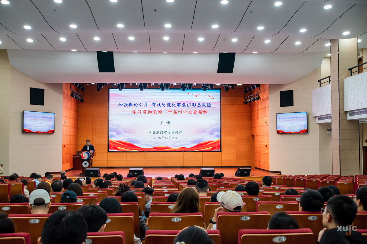 12月2日下午,我校在公共教学楼1号楼101多功能厅举办习近平新时代中国特色社会主义思想大讲坛第75讲暨意识形态工作专题培训会。依托“鹭江讲坛”,我校邀请厦门市委宣传部王博副教授作题为“加强舆论引导 有效防范化解意识形态风险——学习贯彻党的二十届四中全会精神”专题辅导报告。校党委理论学习中心组成员,各党总支书记、党支部书记,辅导员,各单位宣传工作负责人、舆情管理员和相关部门工作人员参加培训会。