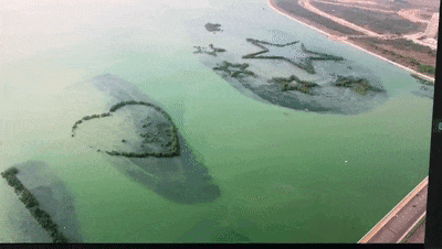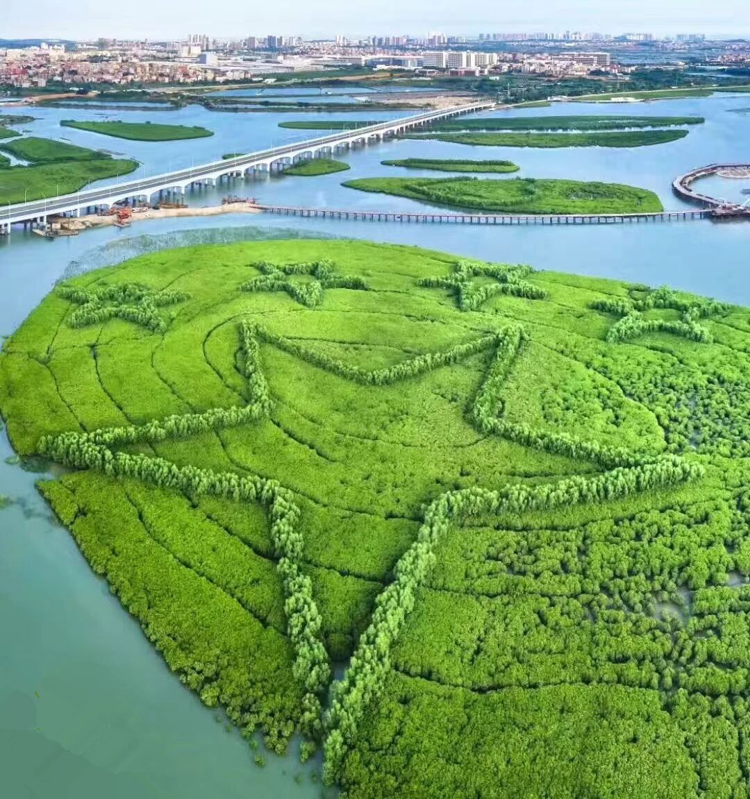 这个作品名为《我爱祖国》,由分布在三个小岛上的用红树林勾勒的大写英文字母“I”、图案“❤”和组图五星及背景红树林构成,单“五星”图案占地就相当于18个足球场大小,是厦门市下潭尾滨海湿地公园一期工程的核心部分。