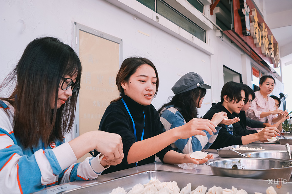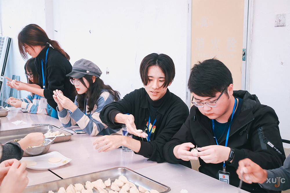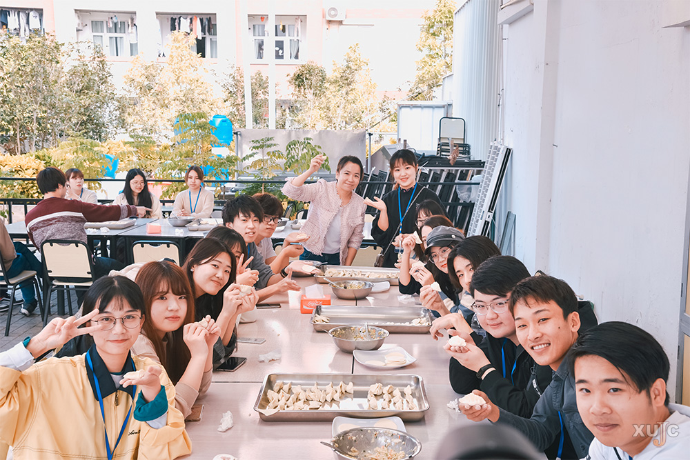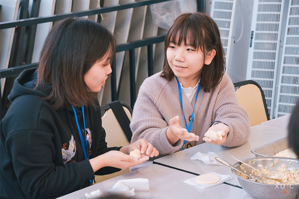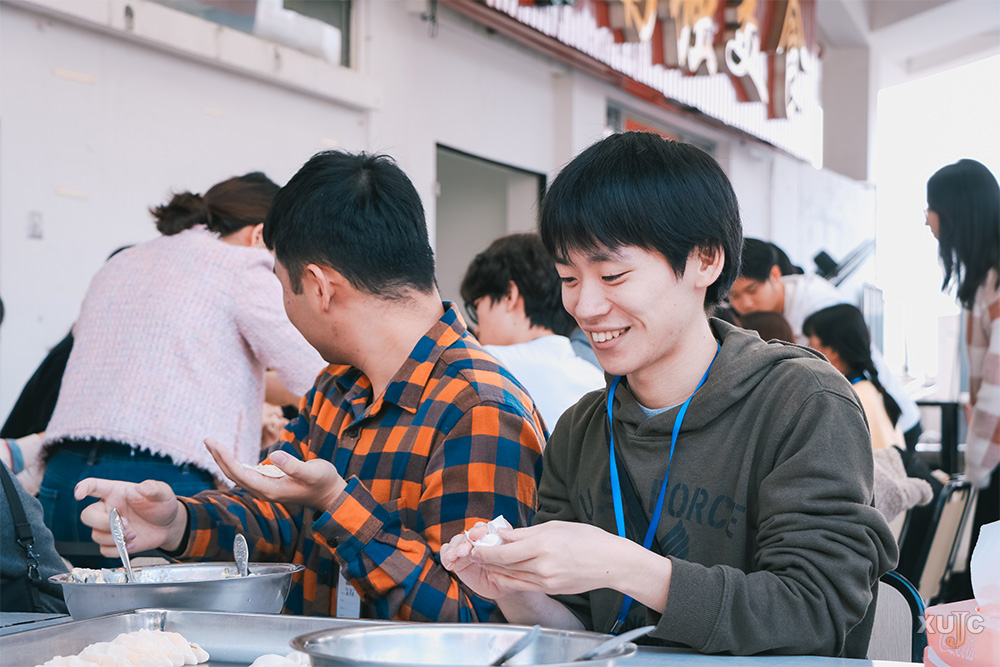 活动中,日本语言与文化学院学子用日语介绍了冬至包饺子的习俗。对这些前来交流实习的日本学子而言,包饺子是一件充满挑战的事。第一次包饺子的他们,略显生涩地处理面皮和饺子馅,做出来的成品形状各样。但是这丝毫不影响他们的心情。他们和我校学子相邻而坐,一边互帮互助包饺子,一边友好交流,其乐融融。