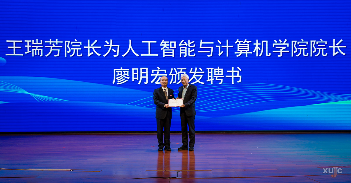 王瑞芳为人工智能与计算机学院院长廖明宏颁发聘书,并与廖明宏共同为人工智能与计算机学院揭牌。