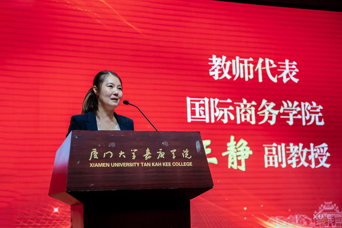 “在新的学习环境中,愿大家能坚持不懈,勇往直前,以坚韧不拔之志攀登知识的高峰。”文商科场教师代表、国际商务学院教师王静认为本科阶段的学习更为宽泛且深入。这需要同学们具备更强的自主学习能力和批判性思维,以应对复杂的理论体系与前沿研究。她代表教师团队郑重承诺:将以满腔热忱与卓越的专业素养,全力为你们铺设一条通往知识殿堂的康庄大道,构建一个充满温暖、和谐与正能量的学习社区,让每一位学子都能在“嘉园”茁壮成长。“亲爱的同学们,你们是否愿意与我们携手并肩,共同创造一个更加美好的未来?” 她满怀期待地向新生发出邀约,并祝愿新生们在“嘉园”这片沃土上茁壮成长,绘就人生华章。