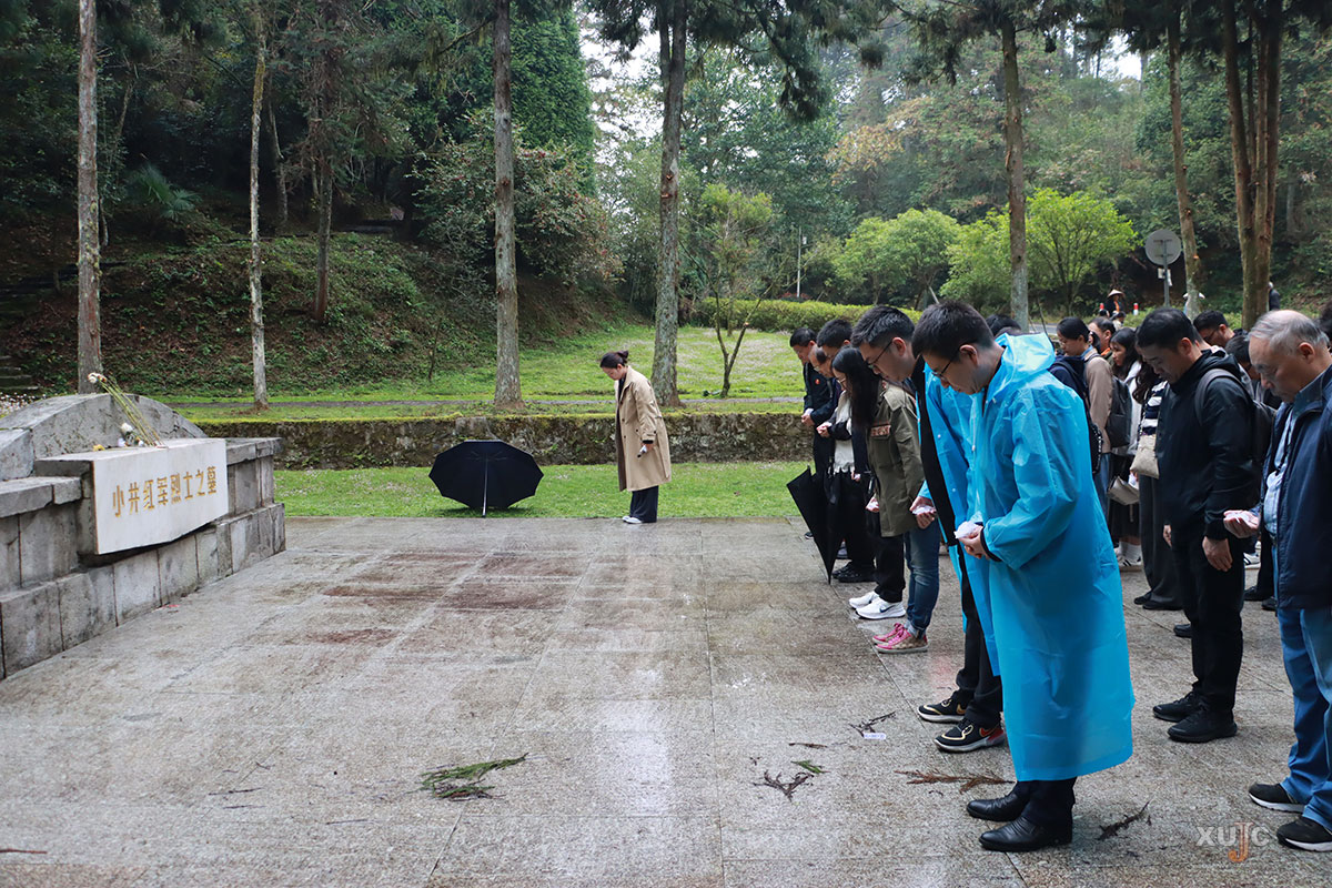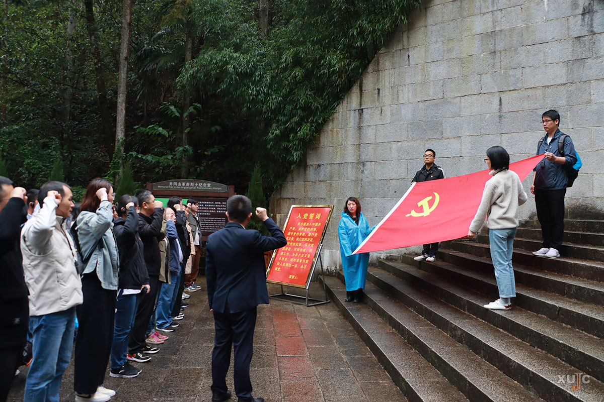 青山处处埋忠骨,细雨如丝祭英魂。在小井红军烈士墓前,学员们肃立聆听“张子清师长献盐”“曾志井冈送子”的感人故事,并为英烈献上自制小白花,表达对革命先辈的缅怀崇敬之情。在井冈山革命烈士陵园,大家怀着无限敬意向革命先烈敬献花圈,面向党旗,高举右拳,进行了铿锵有力的庄严宣誓。