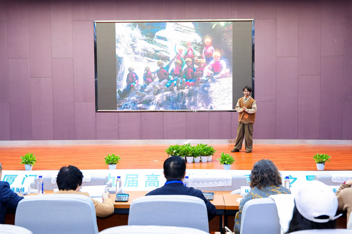 比赛中,黄袈瑞以“厦门大学古籍修复传习中学”为题进行主题演讲,展现了扎实的知识储备与卓越的表达能力。在“数字人+文旅”环节,其视频构思新颖,AI数字人使用恰当,获得了评委的好评。在才艺展示环节,他凭一首生动且富有感情的诗朗诵《青春万岁》,给现场观众留下了深刻印象,充分展示了我校学子全面发展的精神风貌。