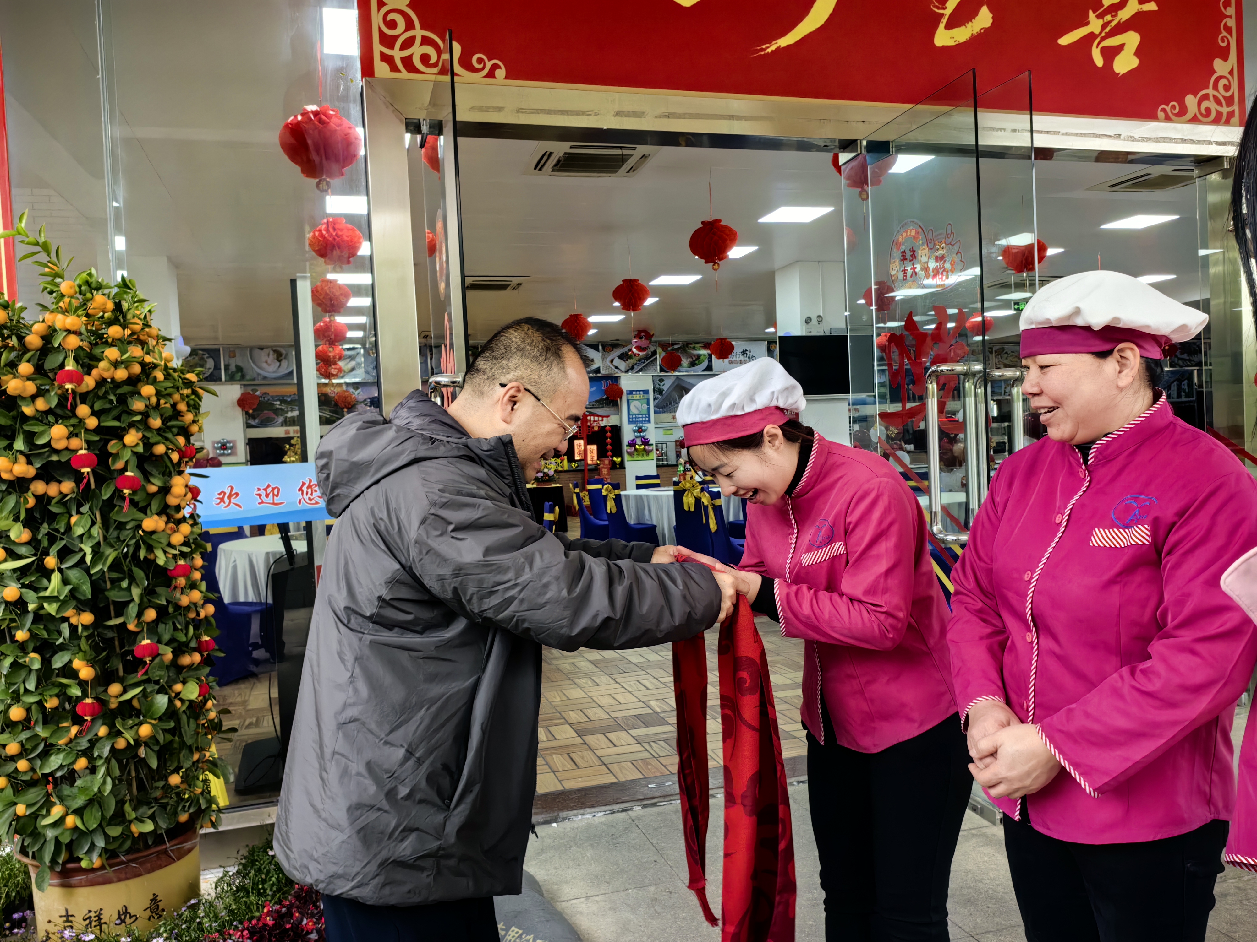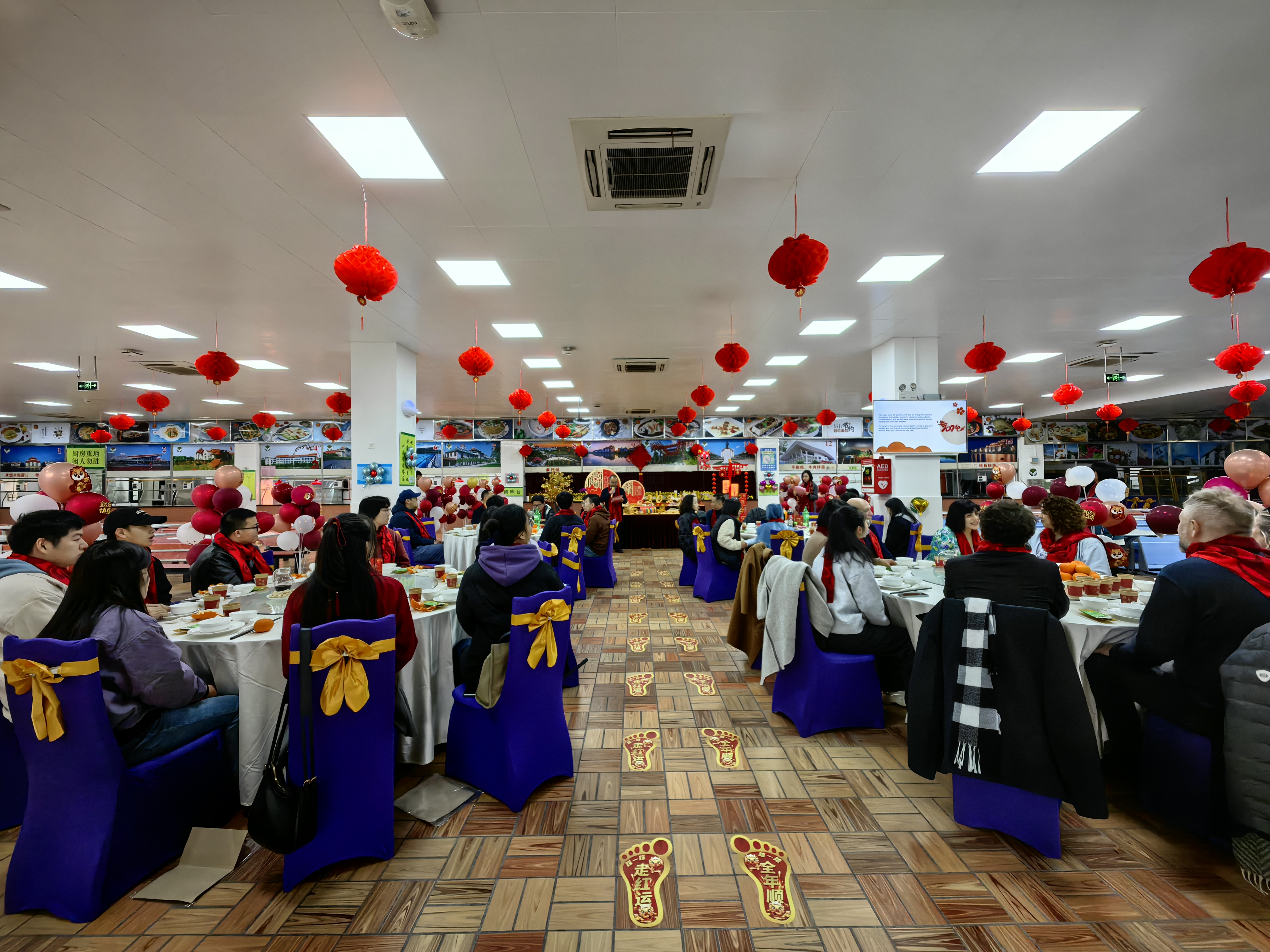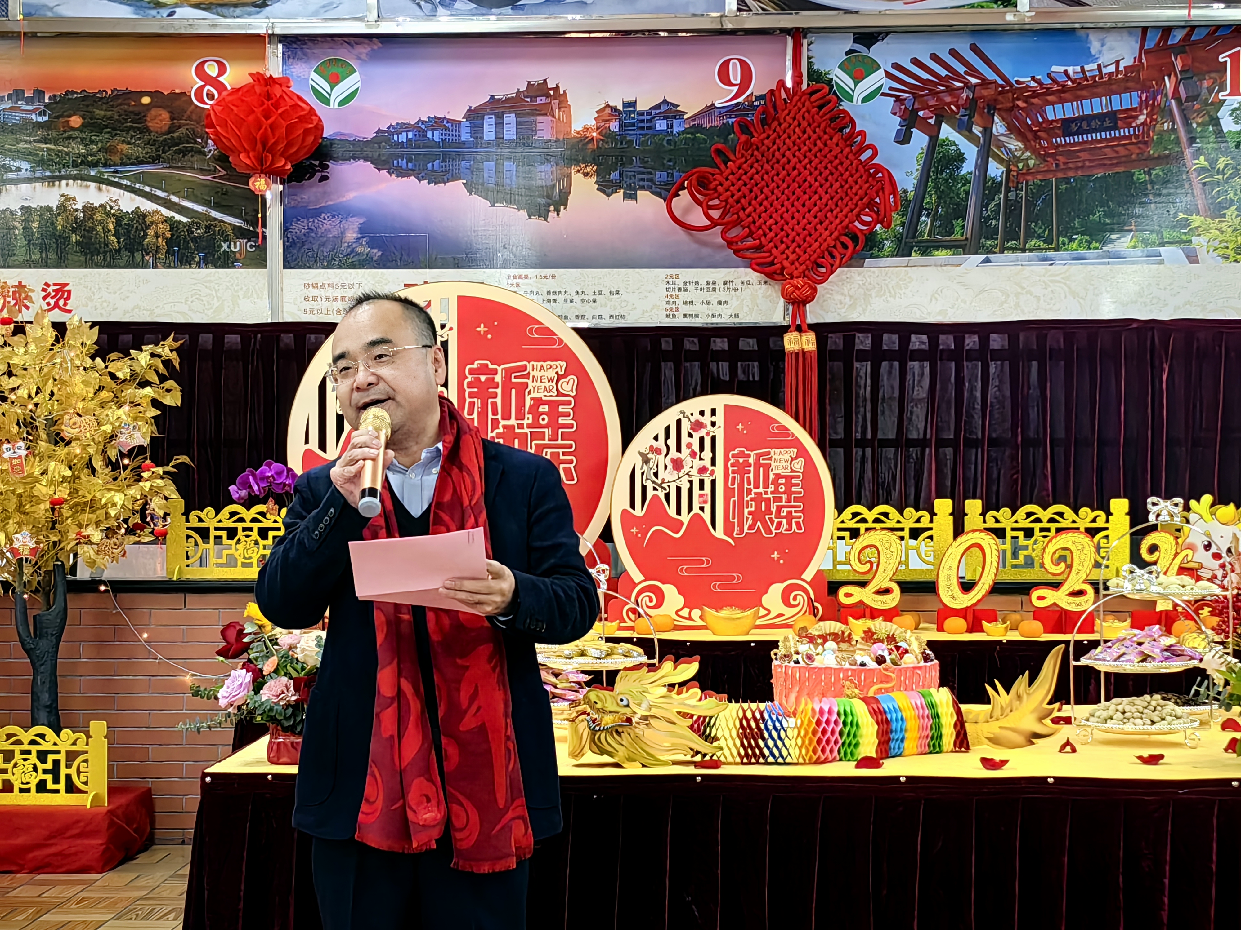 下午4时,中区食堂装扮一新、喜气洋洋,校党委常务副书记黎永强、党委副书记王洁松,院长助理、学工部部长、团委书记姚祖婵与留校师生员工欢喜大围炉。