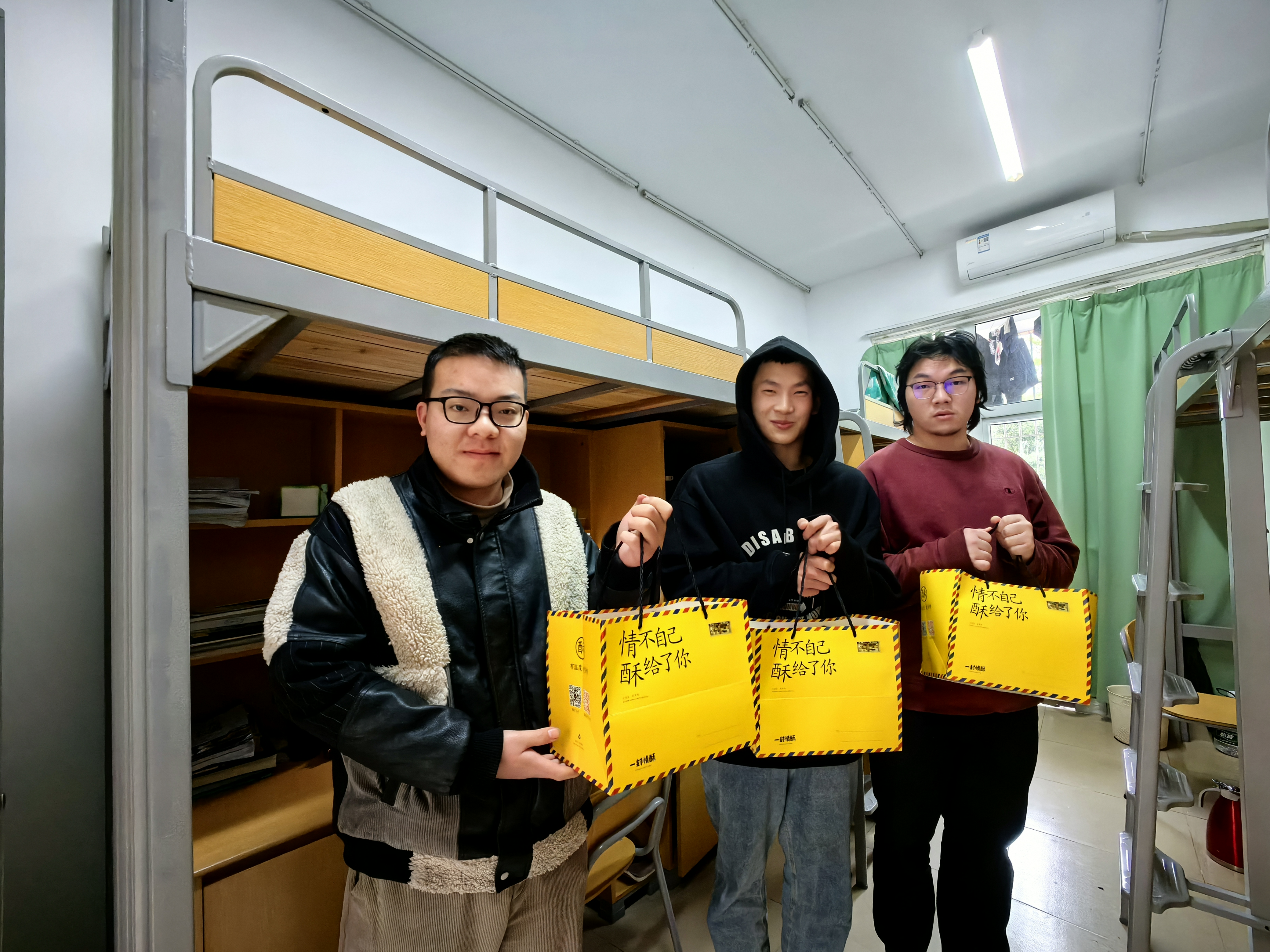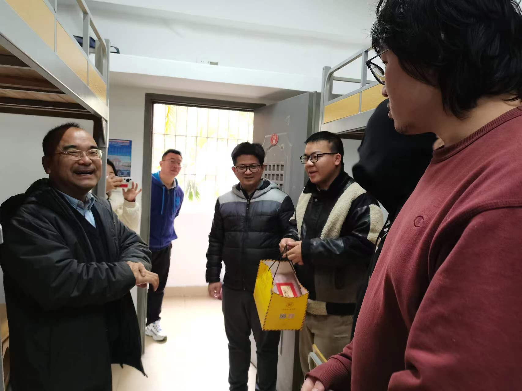 在走访学生宿舍丰庭园区时,黎永强、王洁松等人慰问留校学子。他们详细了解了学子们的留校生活情况和假期安排,并送上学校精心准备的过年大礼包——凤梨酥等闽南特色糕点、笔记本、春节红包。