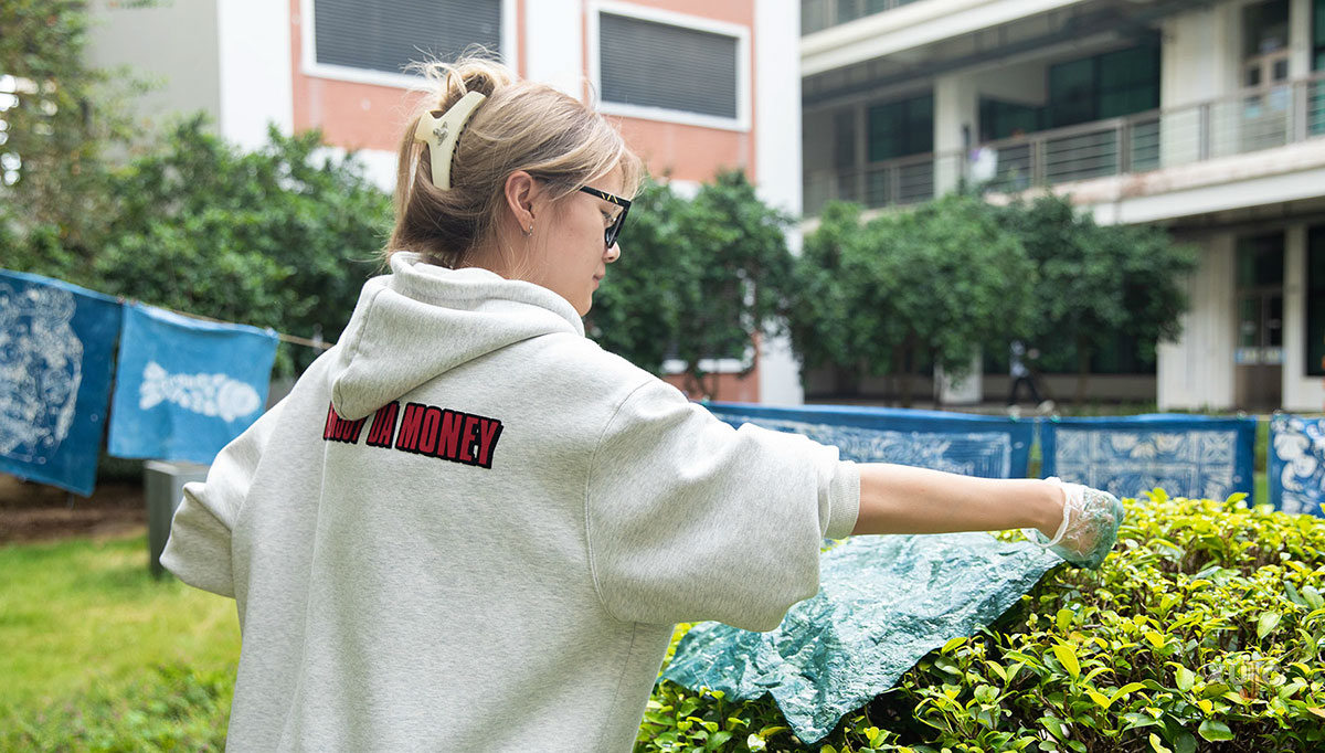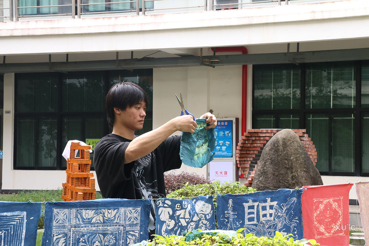 把校训“止于至善”印染成独“嘉”作品,献礼20岁的“嘉园”。(摄影:王子萱)