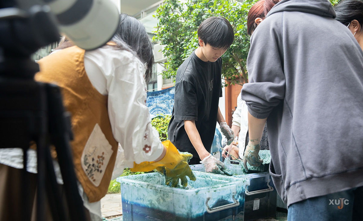 同学们将扎成“疙瘩”的布料放入染缸中浸泡。《扎染创意设计》是该校设计与创意学院的一门兴趣拓展类专业选修课,面向本科二至四年级的本院各专业学生开设。(摄影:韩苏艳)