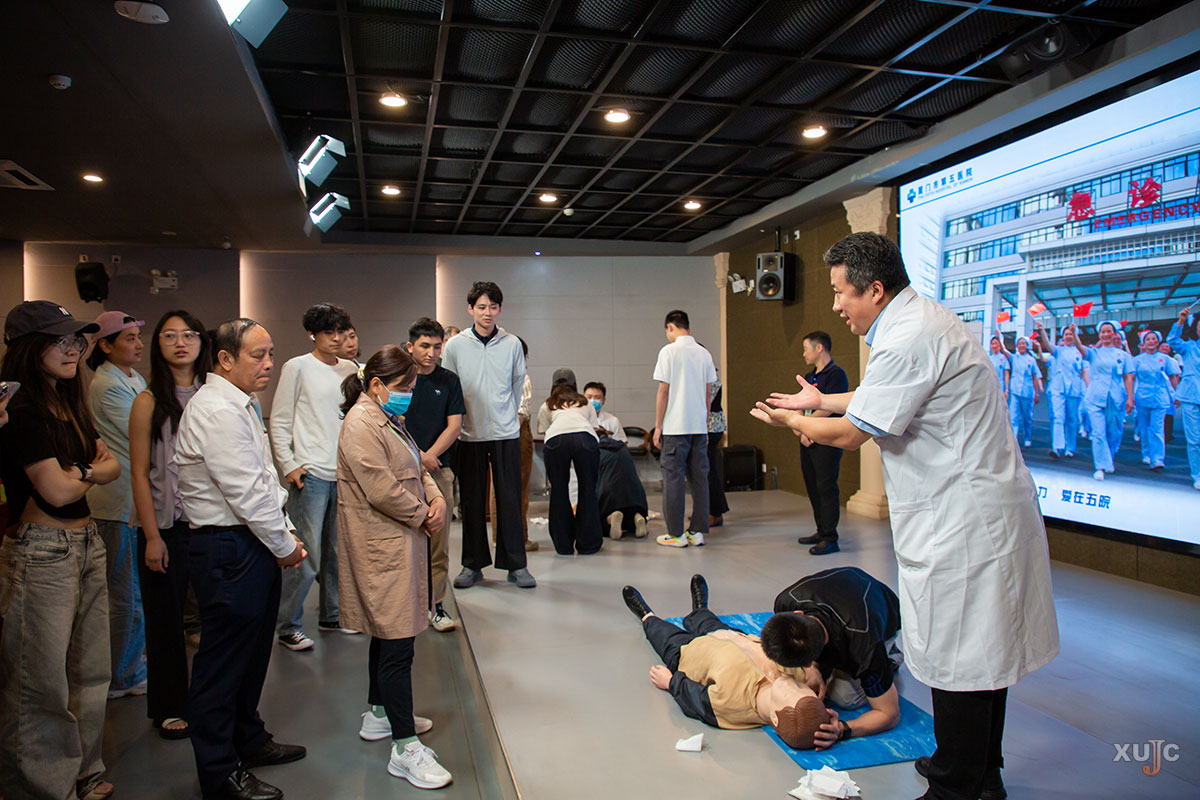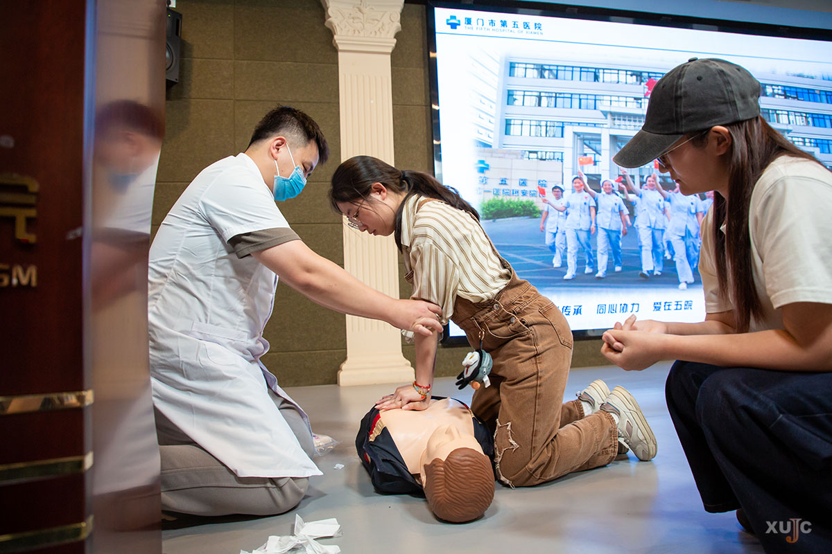 捐赠仪式结束后,厦门市第五医院急诊科副主任杨凯春、医生张金延,携手我校医务室医生林达峰,为在场师生带来了一场生动实用的AED使用与徒手心肺复苏(CPR)技能培训。