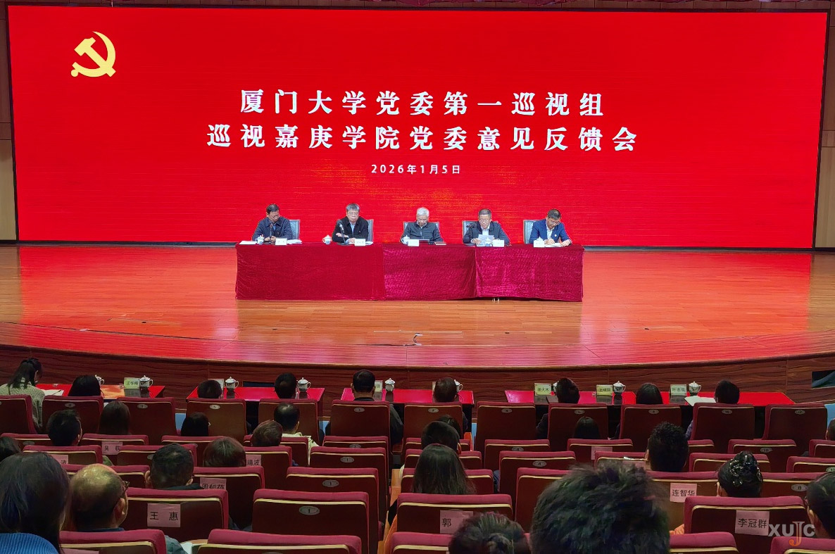 根据厦门大学党委巡视工作统一部署,1月5日上午,厦门大学党委第一巡视组巡视嘉庚学院党委意见反馈会在漳州校区主楼群3号楼大报告厅召开。嘉庚学院院长王瑞芳,厦门大学巡视工作领导小组成员、党委巡视办主任洪真裁,第一巡视组组长邱七星、副组长崔庆炜,厦门大学纪检监察机构、组织部代表,以及厦门大学党委第一巡视组其他成员出席会议。基层党建联络员游泽民,学院党政领导班子成员李军、洪永强、雷锐生、谢火木、杨云良、王晓丽、王冬梅、林斓、叶志筑,各单位主管、副主管,各基层党组织书记、副书记,正高级职称教师,辅导员和青年教师代表参会。会议由嘉庚学院党委常务副书记李军主持。