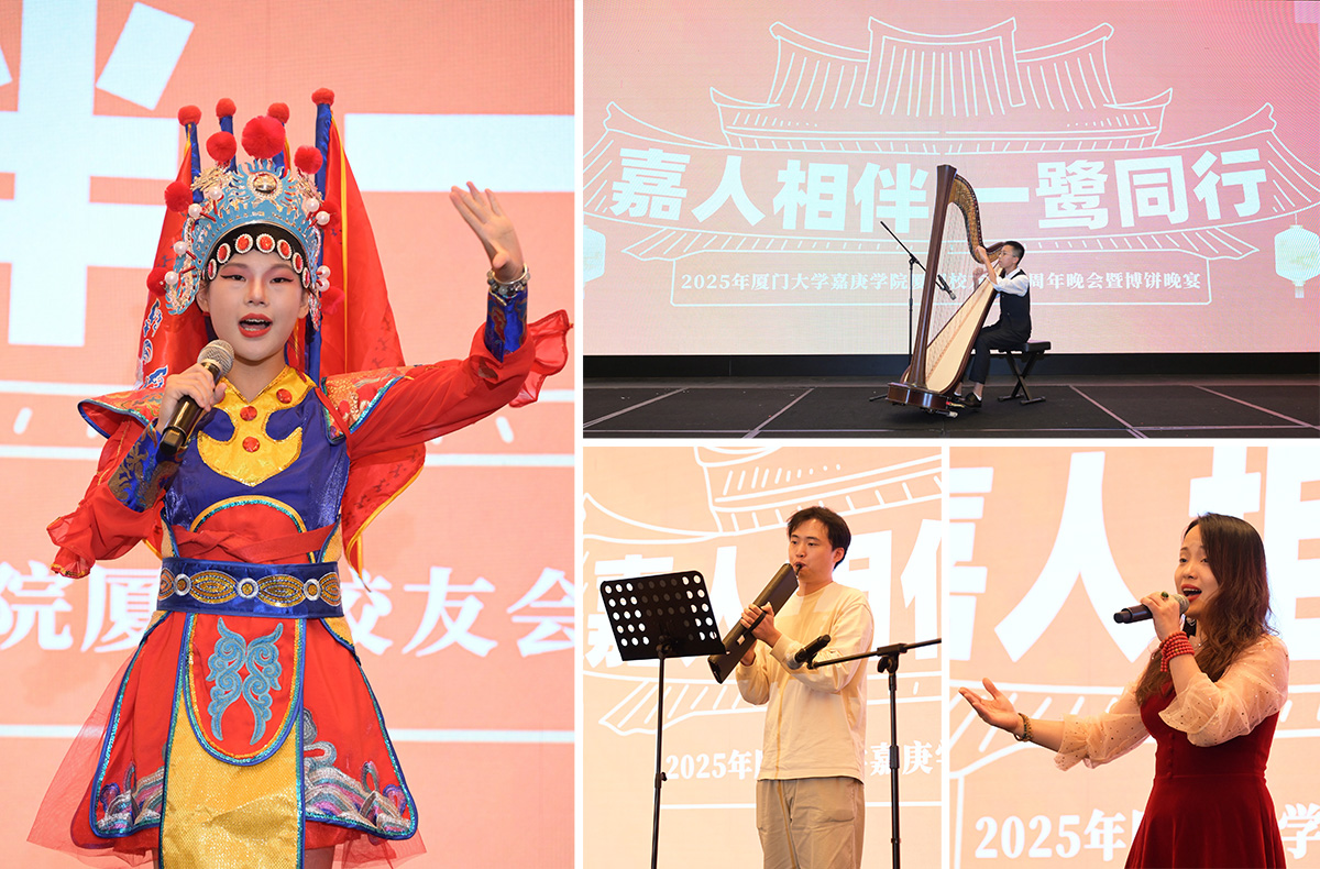 为充分展现厦门校友会的蓬勃风采与深厚底蕴,活动现场精心穿插了由校友、校友企业及校友子女联袂呈现的精彩表演。音乐与舞蹈学院2017届校友余思彤指导的学生陈嘉瑶,以一曲《说唱脸谱》惊艳亮相,将传统戏曲与现代音乐完美融合;国际商务学院2010届校友黄斯毅、徐珊珊的爱子黄致嘉,带来竖琴演奏《巴洛克弗拉明戈》,展现了古典与现代的碰撞;信息科学与技术学院2023届校友、厦门校友会艺术团成员林涤新,用口风琴演奏《能看见海的街道》,旋律悠扬,仿佛带领观众漫步于海滨;而压轴登场的余思彤,则以一曲《灯火里的中国》,深情表达了嘉庚学子从校园到社会,始终带着母校的印记砥砺前行的坚定信念。