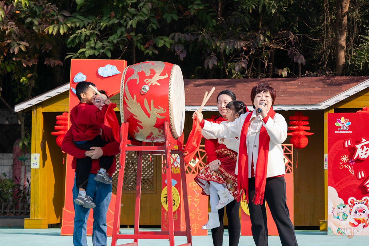 伴随着“新年乐翻天”欢乐的新年主题曲,灵“蛇”引路,家长和孩子们笑逐颜开,手牵手,带着对新年的憧憬,一齐穿过“幸福门”!亲子互动扭动四季、振奋激昂的鼓声、活灵活现的舞龙队,引得大小观众连连喝彩!幼儿园执行园长秦燕携同家长与幼儿代表一起敲响大鼓,新年庙会正式拉开帷幕!
