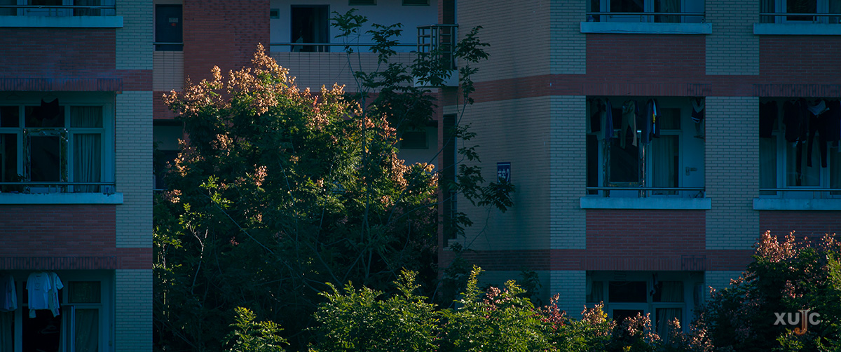 守在宿舍楼前的栾树与阳台飘动的衣影构成了一幅画