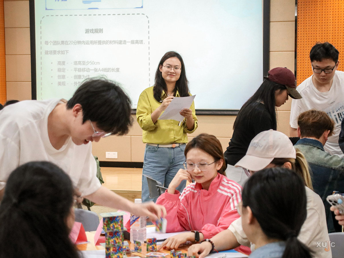 在群体面试和领导力教学环节,厦门大学学生就业创业指导中心丁渡老师通过“建塔游戏”组织实战:6个小组用扑克牌搭出50厘米高、能平稳移动的高塔。有小组中途倒塌却笑称“我们是嘉庚学院的比萨斜塔”,有小组将建筑学原理融入设计,创意十足。丁老师总结道:“面试官看的不是你搭得多高,而是你怎么搭、怎么聊、怎么扛住压力。”