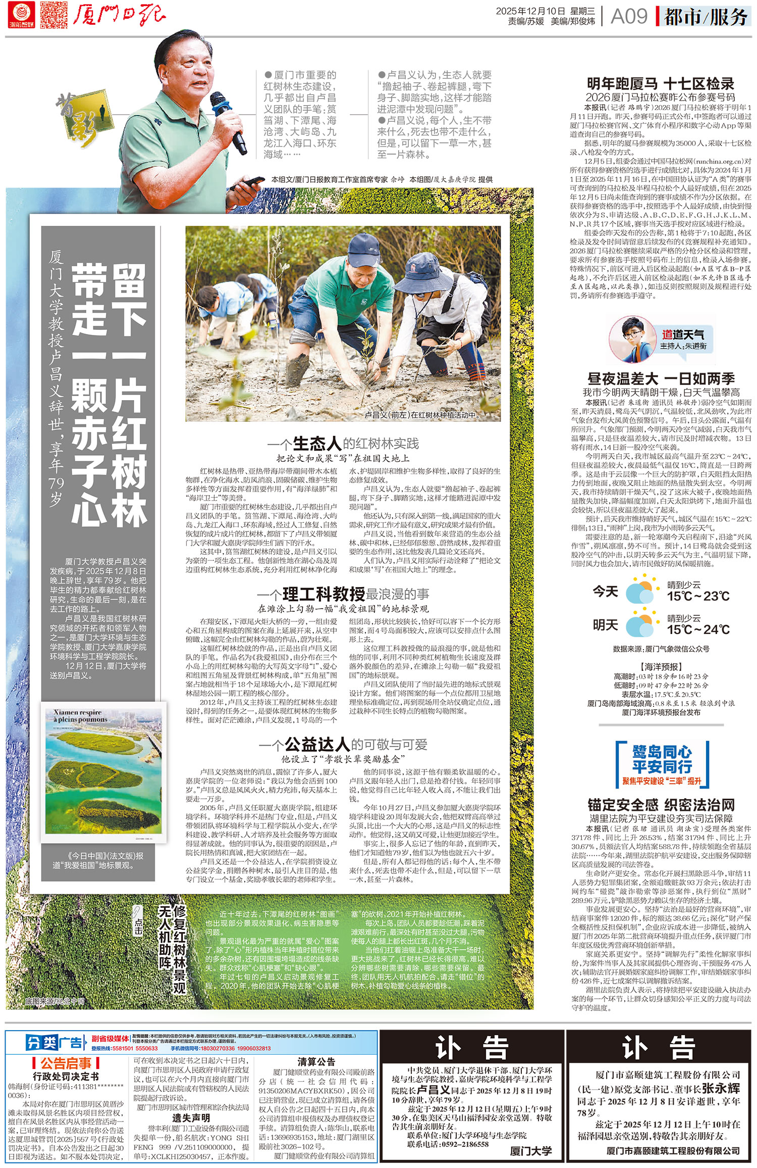 厦门大学教授卢昌义突发疾病,于2025年12月8日晚上辞世,享年79岁。他把毕生的精力都奉献给红树林研究,生命的最后一刻,是在去工作的路上。