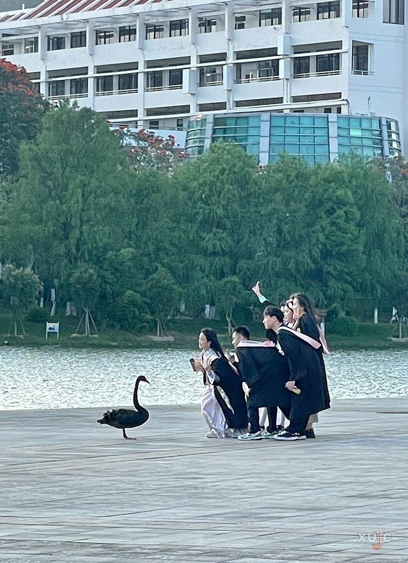 自2023年10月,黑天鹅落户“嘉园”后,它们就备受“嘉”人们的喜爱,成了校园里的一道亮丽风景线。姚子豪开心地分享道:“以前我们在栖霞湖畔背书时,常见到它们在湖中优雅地游弋。那一刻,所有的压力都仿佛随着水波消散。之前,我们都没有见过黑天鹅上岸,拍毕业照时竟然碰到了,真的是喜上加喜!”