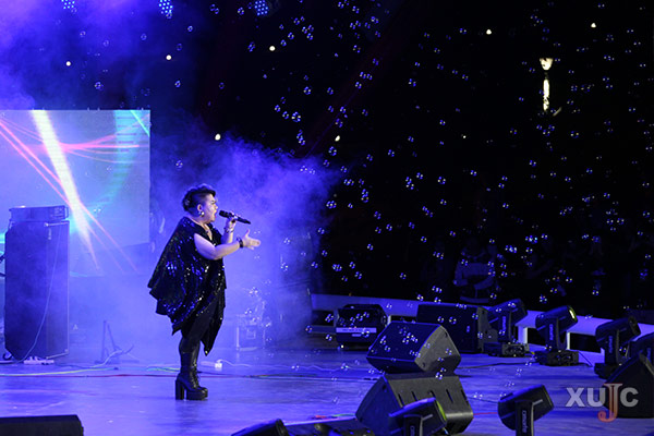 薄荷绿乐队以一曲《绵羊》拉开了校友歌会的序幕,动人的歌声诉说着对母校的感激之情。随后,穿着帅气的乐队女主唱、2015届校友梁倩演唱原创歌曲《表演家》,并带领大家亮起手机上的灯光,跟着音乐的节奏摆动,带动了现场观众的情绪。