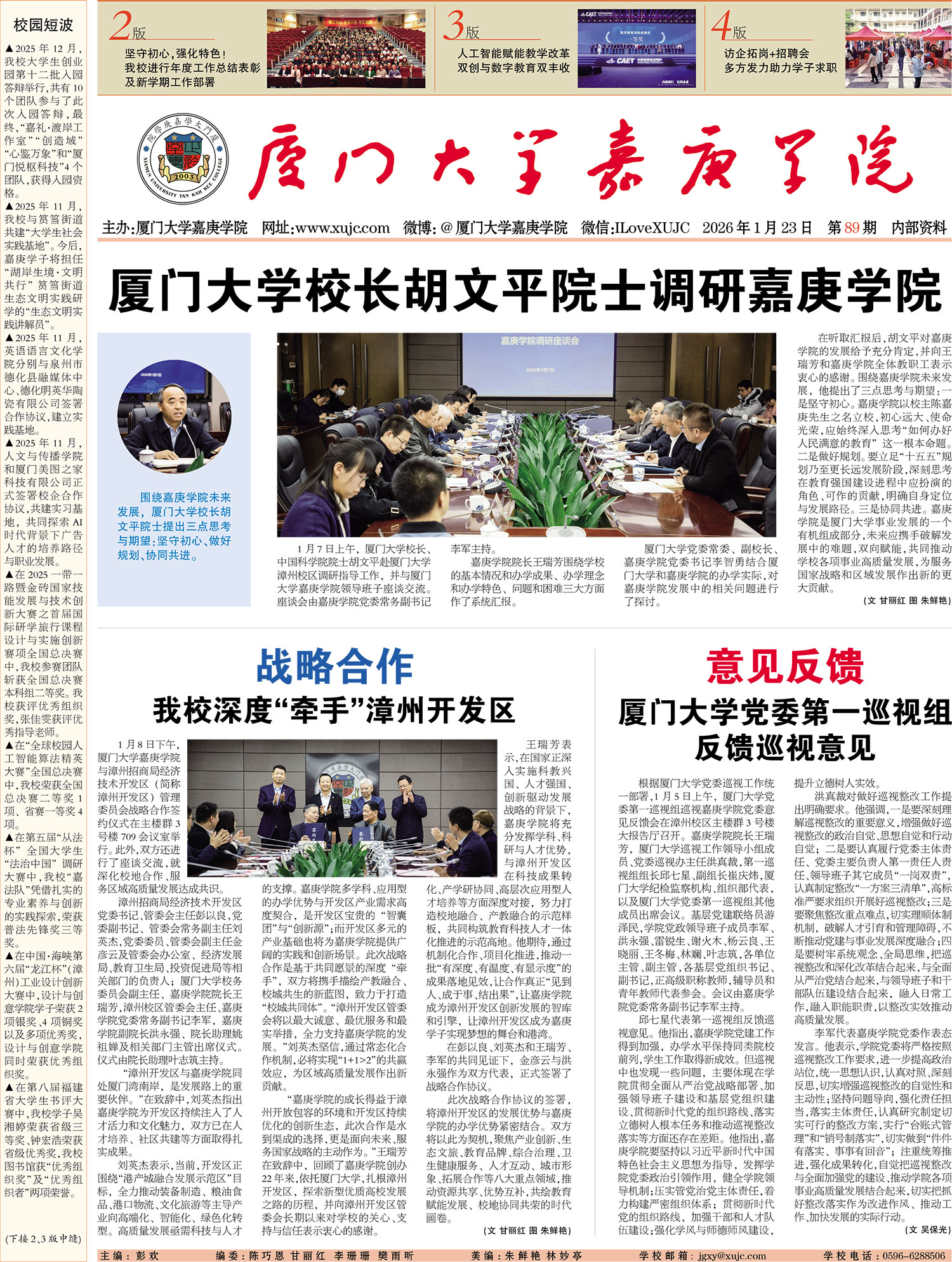1月7日上午,厦门大学校长、中国科学院院士胡文平赴厦门大学漳州校区调研指导工作,并与厦门大学嘉庚学院领导班子座谈交流。座谈会由嘉庚学院党委常务副书记李军主持。