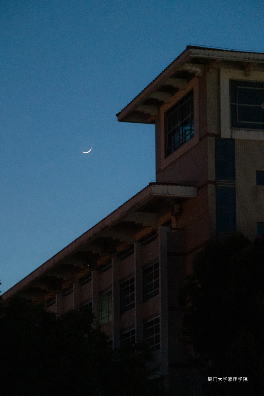 在弦月的衬托下,楼房多了一分静谧与安逸