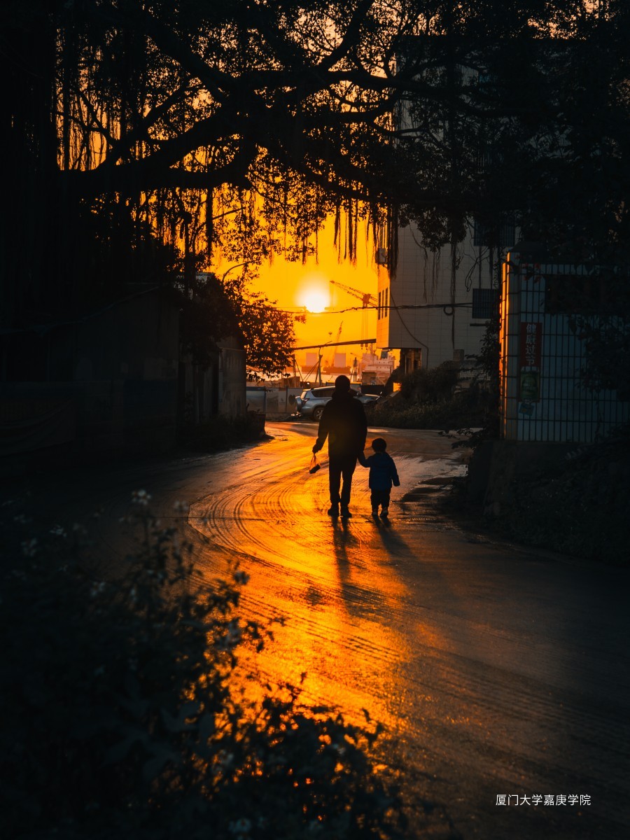 拍摄于一个将要被拆迁的村落,前方是蓬勃兴建的城市工程,路面刚驶过一辆洒水车,反射着日落的温柔,一对父子携手走在回家的路上。